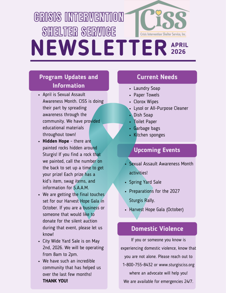 On behalf of everyone at Crisis Intervention Shelter Service, we wanted to extend our deepest gratitude and say thank you to the Sturgis Rally Charities of allowing us to be recipient again this year! We are so thankful for the belief and support in our mission and the services we provide in our community.